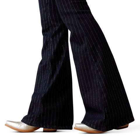 Rodeo after-party. Holiday cocktail hour. New Year's Eve bash. This fun jean shines in any scenario. Silver metallic pinstripes add sparkle; the flared silhouette gives you legs for days. Style # 10053532.