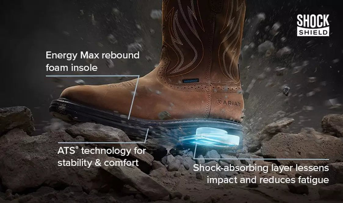 Fear no impact, feel no fatigue. Sierra Shock Shield helps you stay comfortable longer absorbing impact to your feet. Extremely durable, cushioned, and heat-resistant, it's ideal for harsh outdoor jobs, high heat environments, and intense construction work. Style # 10044544.