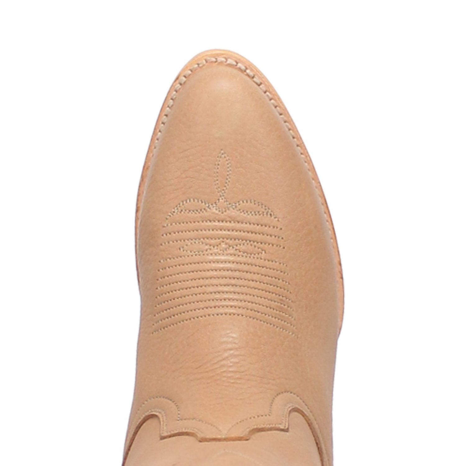 Looking to hop on the fast track to peak style and comfort? Enter the Dan Post Pike all-leather boot in natural with a medium round toe, cowboy heel and Soft Strike Removable Orthotic. The simple western accents and pull-on straps make this boot your one-way ticket to greatness. Style # DP2479.