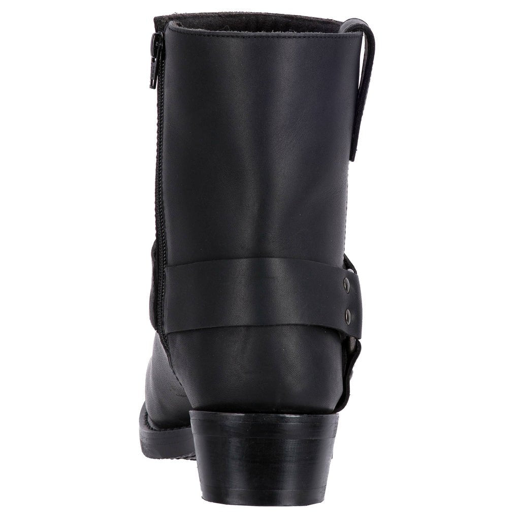 Hit the road in style with the Rev-Up moto boot. Constructed with a durable, full-grain leather with a smooth finish. The 7 shaft sits under a leather harness strap attached by a silver ring. Snoot toe, dogger heel, easy-on side zipper, and oil-resistant outsole. Style # DI19090-BK.
