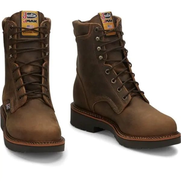 The Blueprint Tan Gaucho 8, 8-inch tall J-Max men's lace-up work boot features a golden brown leather exterior crafted for durability that's slightly distressed to give this boot a lived-in look. It's built for comfort with the J-Max Double Comfort System that utilizes a mesh spacer foot bed cover that provides extra comfort and a healthy environment for the foot and the J-Max removable orthotic inserts with J-Flex Flexible Comfort System with Justin Jel offer a multi-density foam cushion that absorbs initial impact and provides energy return as you walk. The encapsulated air cells to virtually eliminate compression set so the bounce of cushioned energy return is present for the life of the boot and the strategically placed polyurethane gel pads in the heel arch and ball area reduce muscle fatigue for unparalleled comfort. This boot also features the Dri-Lex cooling system that pulls moisture from the inside of the shoe, leaving the insole dry and cool as well as a durable dual-density polyurethane slip resisting outsole that meets ASTM F2892-11 for electrical hazard safety footwear standards. Style # 440.