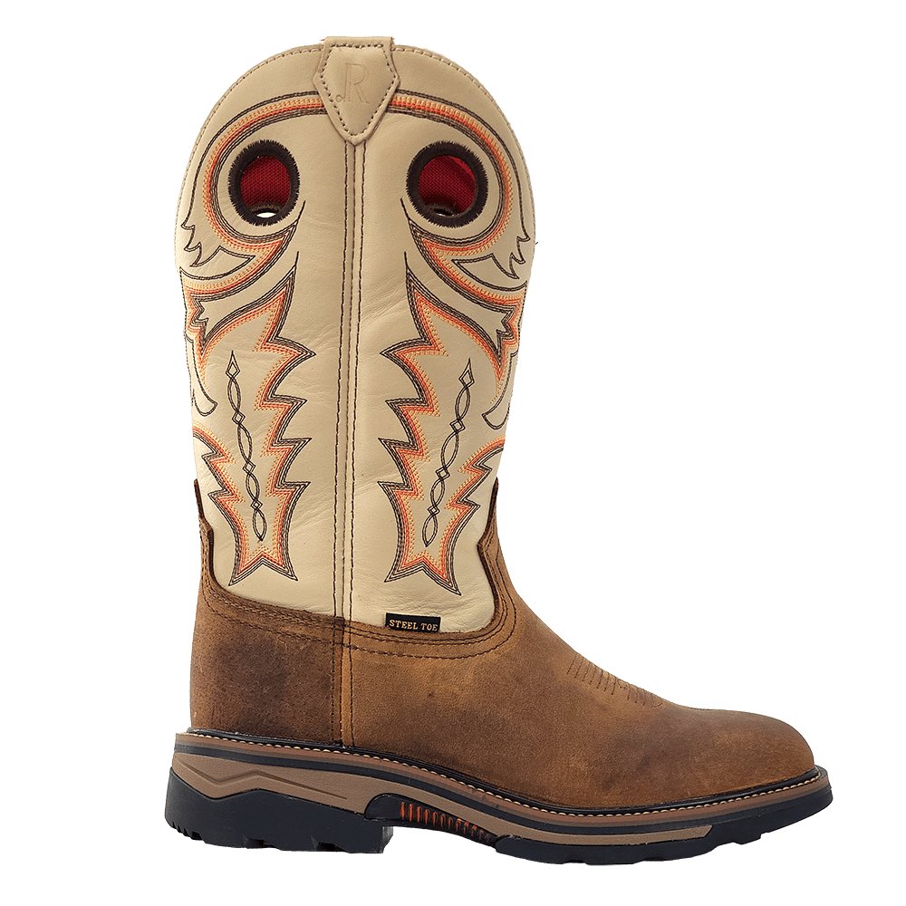 R. Watson presents these distressed chestnut and ivory bone square toe work boots. These work boots have a 10 row stitch patter, pull holes, removable orthotic insole, EVA midsole and a block heel. Style # RW1011.