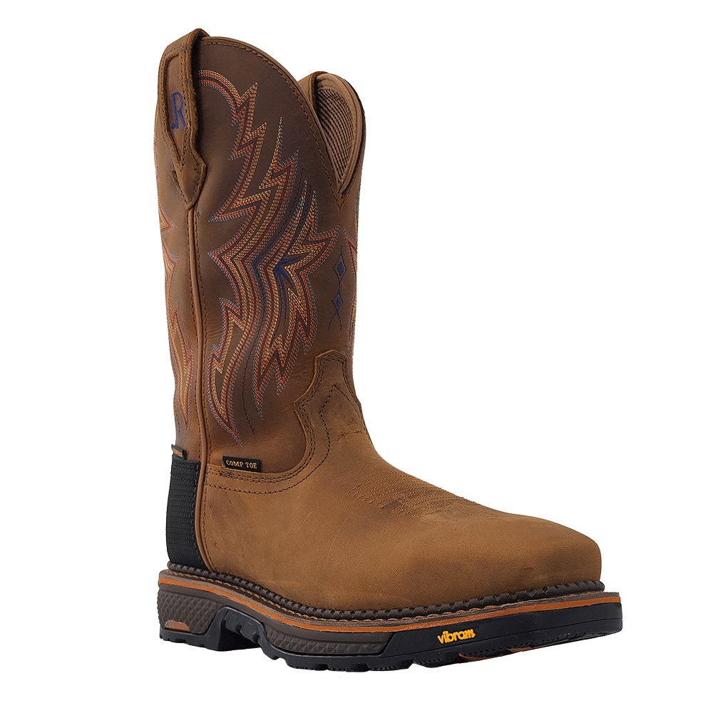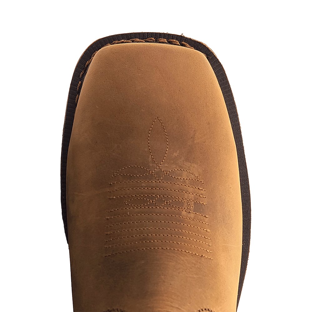 R. Watson presents these tan cowhide and bay cowhide square toe work boots. These work boots have a 10 row stitch pattern, removable orthotic insole, EVA midsole, Vibram unit sole. They are EH, slip and oil resistant. 12″ total in height. Style # RW1200-CT-WP.
