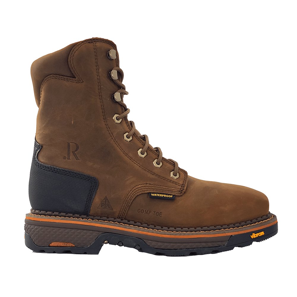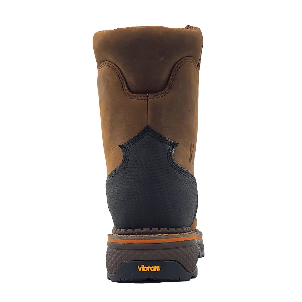 R. Watson presents these 8 inch peanut cowhide square toe work boots. These lace up work boots feature, removable orthotic insole, EVA midsole, Vibram unit sole. They are EH, slip and oil resistant. 8″ total in height. Style # RW1220-WP.