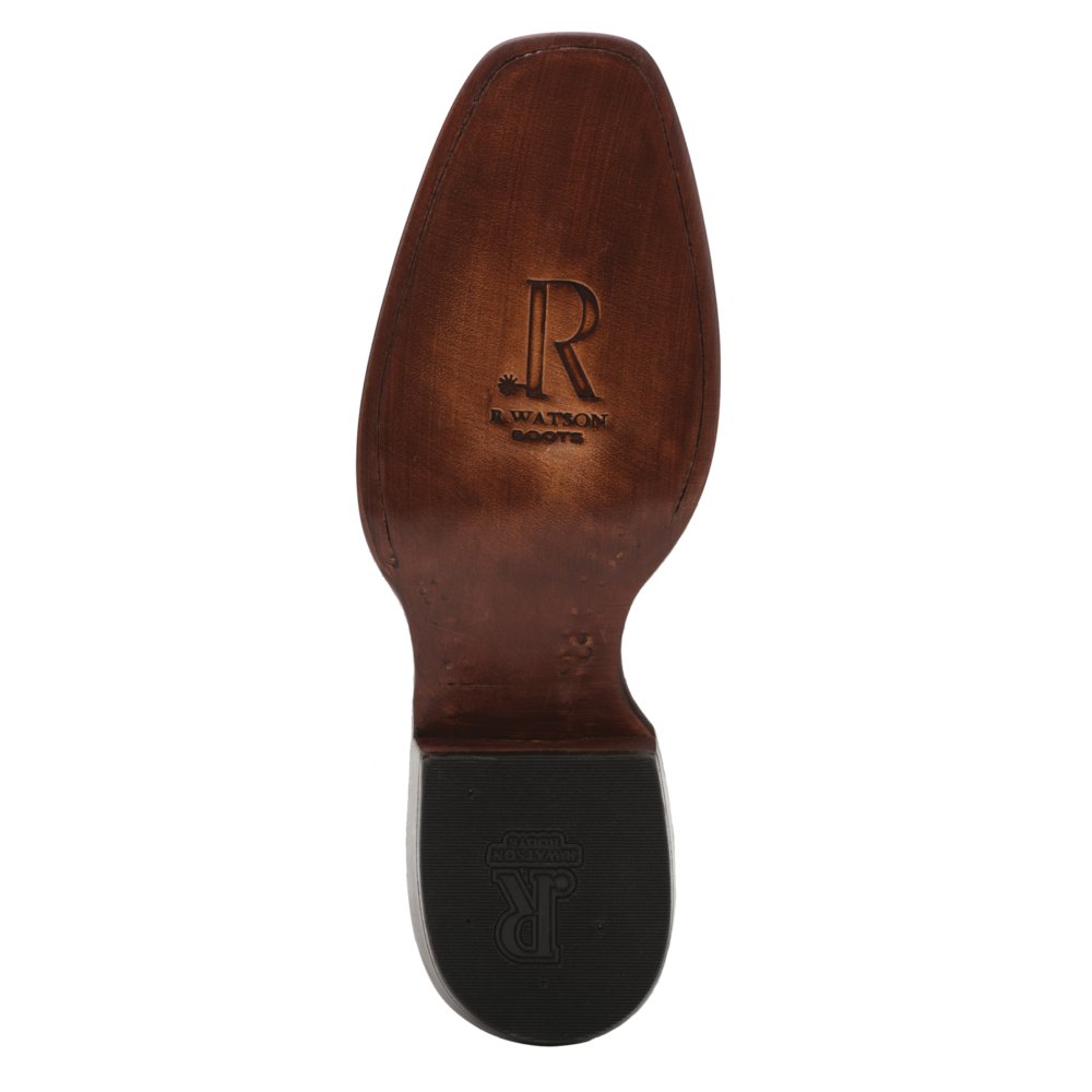 R. Watson presents these black full quill ostrich and black luster goat exotic western boots. These boots have a corded stitch pattern, R. Watson comfort system, all leather stacked heel, counters, solid steel shank, and 10 iron outsole. 13″ total in height. Style # RW4000.
