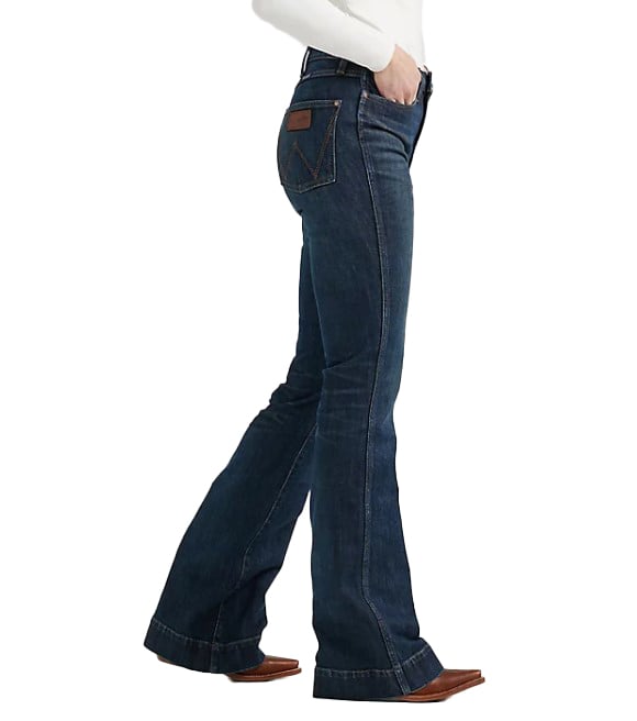 Flattering from every angle, the Women’s Wrangler Retro Bailey High Rise Trouser Jean is a best-kept secret for ladies who love volume. These denim trousers are crafted from a cotton blend with just a hint of stretch for all-day comfort. They come with a high-rise silhouette, a close fit through the thigh, and a 20.5” flared leg full of vintage vibes. Plus, the five-pocket styling, “W” pocket stitching, and logo patch bring an unmatched level of Western authenticity. Style # 112356616.