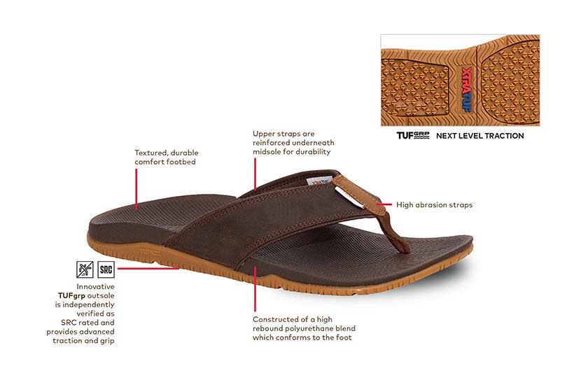 A sandal built for our community of DO-ERs. The Auna Flip Flop is the result of years of testing and refinement. The Auna incorporates a high rebound PU footbed coupled with an abrasion resistant forefoot strap. This sandal is built to be supportive and comfortable for long days on the water or land. It features the innovative TUFgrp outsole, a revolutionary patent pending design constructed from a specially formulated rubber compound. TUFgrp provides next level traction on flat and hard surfaces as well as wet and uneven terrain. TUFgrp is independently verified SRC rated to deliver next-level non-marking grip. Style # AUNM900.